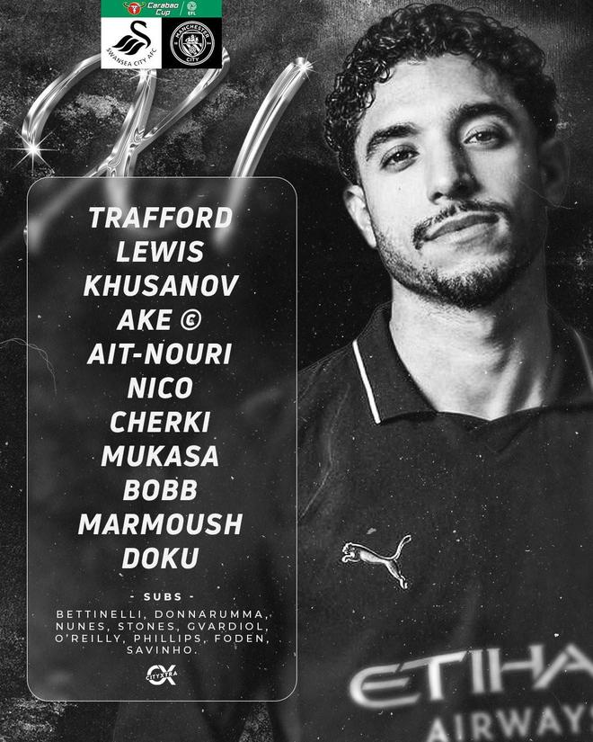 曼城首发:1-特拉福德、82-里科-刘易斯、45-胡桑诺夫、6-阿克、21-努里、14-尼科-冈萨雷斯、10-谢尔基、52-奥斯卡-鲍勃、7-马尔穆什、11-多库、63-穆卡萨
